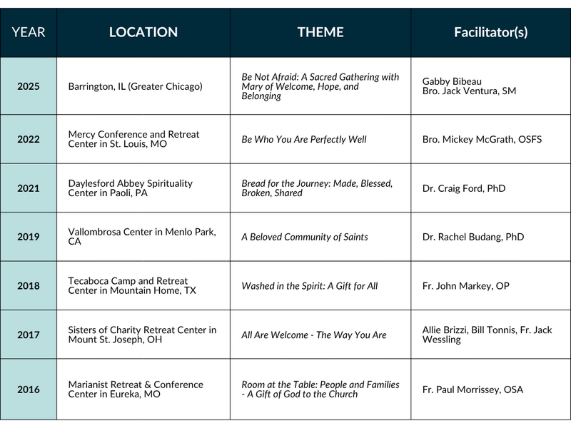 The LGBTQ+ Initiative Team often plans and hosts a weekend retreat for LGBTQ+ persons, their families, and allies. The retreat is filled with opportunities for spiritual renewal, teachings of the faith, and time for building community, faith sharing, and fellowship--all with the LGBTQ+ person in mind. See a full list of retreats, themes, and speakers below. Our next retreat will be held in 2027!